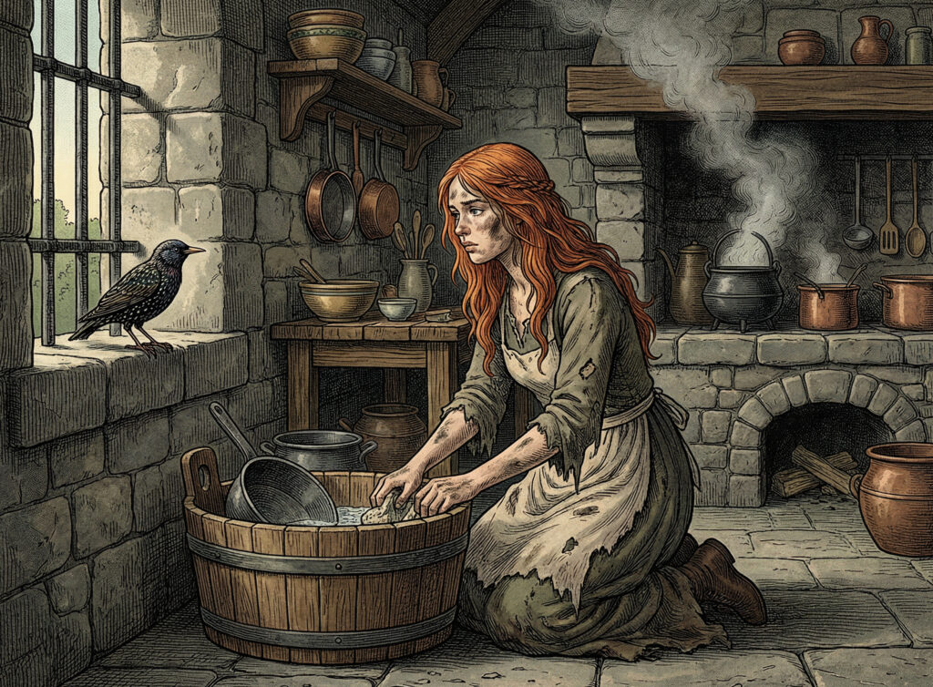 At first, Branwen was treated with respect and lived happily. But one of her half-brothers was angry that he was not asked about the marriage, and in his anger, he did something very wrong that upset Matholwch. Over time, some people in Ireland began to treat Branwen badly. She was no longer treated like a queen and had to work in the kitchens.