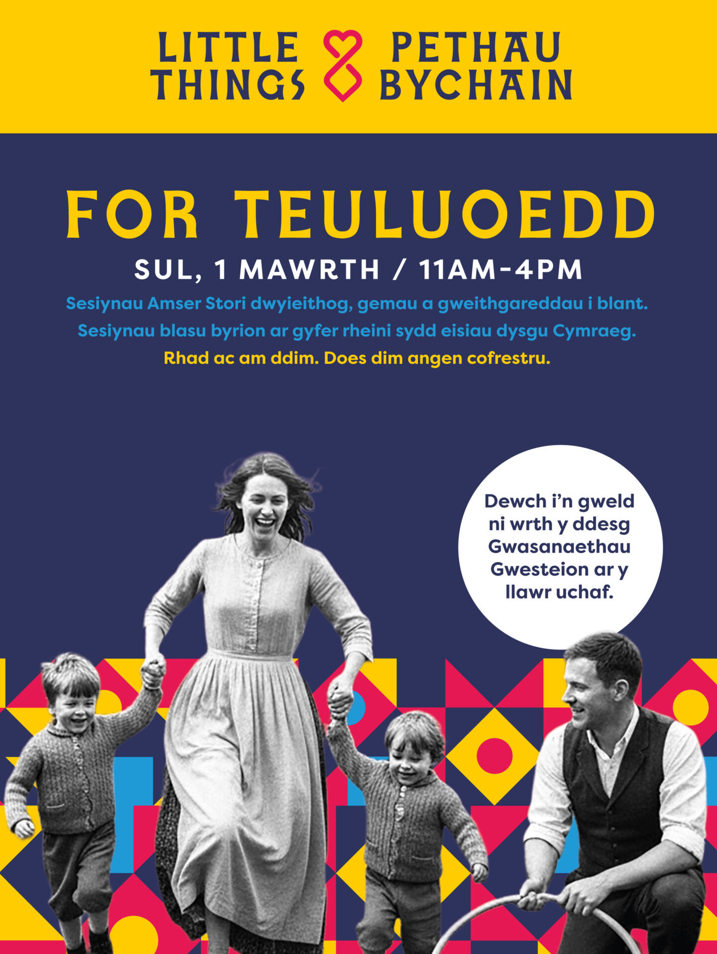 Cyfarfod â theuluoedd eraill, mwynhau amser gyda’r plant a dechrau Llwybr Straeon y Mabinogi yn ein parth FOR Teuluoedd yn St. David’s Dewi Sant!